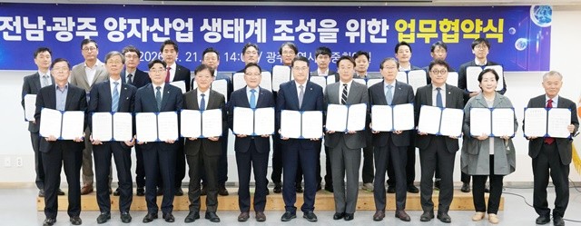 [위키트리 광주전남취재본부 노해섭 기자]전라남도와 광주광역시가 4차 산업혁명을 넘어 미래 국가 경쟁력을 좌우할 핵심 전략 기술인 ‘양자산업’의 주도권을 잡기 위해 하나로 뭉쳤다. 두 지자체는 21일 광주시청에서 23개 주요 기관이 참여하는 대규모 업무협약식을 열고, 양자산업 생태계 조성을 위한 강력한 초광역 협력체계의 닻을 올렸다고 밝혔다.