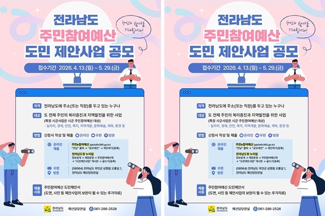 [위키트리 광주전남취재본부 노해섭 기자]전라남도가 2027년도 예산 편성을 위해 도민들의 생생한 아이디어를 직접 수렴하는 ‘주민참여예산 제안사업’ 공모를 오는 5월 29일까지 진행한다. 주민참여예산제도는 예산의 편성 과정에 주민이 직접 참여할 권리를 보장함으로써, 지방재정 운영의 투명성과 민주성을 획기적으로 높이는 핵심 제도다.
