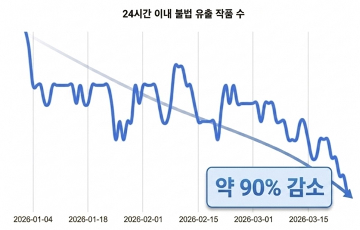 네이버웹툰은 불법 복제 차단 전담 시스템인 '툰레이더'를 고도화해 왔다. 네이버웹툰이 올해 4월 발표한 '2026년 1분기 툰레이더 리포트'에 따르면, 한국어 서비스에 최신 유료 회차가 공개된 후 24시간 이내에 불법 사이트로 유출되는 작품 수가 1분기 말 기준 연초 대비 약 90% 감소했다. 불법 복제 속도가 빠른 상위 100개 작품에서 최신 회차 불법 유출 시점이 연초보다 평균 2회차 이상 지연됐다. 불법 웹툰 사이트 입장에선 최신 내용을 불법으로 가져오려면 기존보다 최소 2주를 더 기다려야 하는 구조가 된 것이다. 불법 복제가 지연된 주간과 그렇지 않은 주간을 비교하자 유료 결제액 평균이 23% 증가했고, 일부 작품은 60%를 기록하기도 했다.