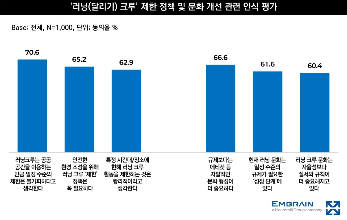 러닝 크루 활동에 일정 수준의 제한이 필요하다는 응답도 70.6%에 달했다. 공원이나 하천변, 도심 보행로처럼 일반 시민과 러너가 함께 이용하는 공간에서는 크루 규모나 활동 방식에 대한 기준이 필요하다는 인식이 반영된 결과로 풀이된다. 안전한 환경 조성을 위해 제한 정책이 필요하다는 응답도 65.2%로 나타났다. 다만 규제보다 에티켓 등 자발적인 문화 형성이 더 중요하다는 응답도 66.6%로 집계돼 공공 공간 이용 질서와 개인 운동 문화 사이의 균형이 요구되는 상황이다.