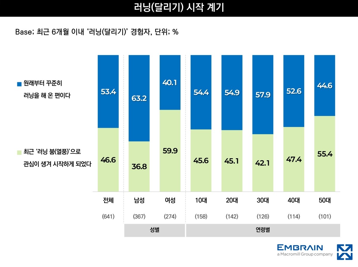 연령대별로는 10대가 79.0%로 가장 높았고 20대가 71.0%로 뒤를 이었다. 30대는 63.0%, 40대는 57.0%, 50대는 50.5%로 나타났다. 젊은 층에서 경험률이 두드러졌지만 중장년층에서도 절반 이상이 최근 러닝을 경험한 것으로 조사됐다. 특히 여성과 고연령층에서는 최근 러닝 열풍으로 관심이 생겨 시작했다는 응답이 상대적으로 높게 나타났다.