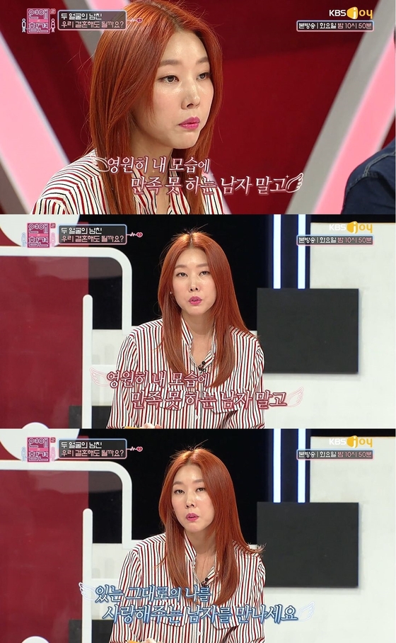 한혜진은 '두 얼굴의 남친, 우리 결혼해도 될까요' 고민 주인공에게는 "영원히 내 모습에 만족하지 못하는 남자 말고 있는 그대로의 나를 사랑해주는 남자 만났으면 좋겠다"는 조언을 남기기도 했다.