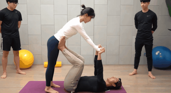 이번 동작은 하체를 풀어주는 동작이다. 우선 파트너 등 부위에 엉덩이를 대고 천장을 향해 눕는다. 다리를 쭉 펼친 상태에서 파트너의 손목이나 더 욕심낸닫면 발 앞꿈치를 잡고 끌어준다. 이 상태를 5초간 유지한다.