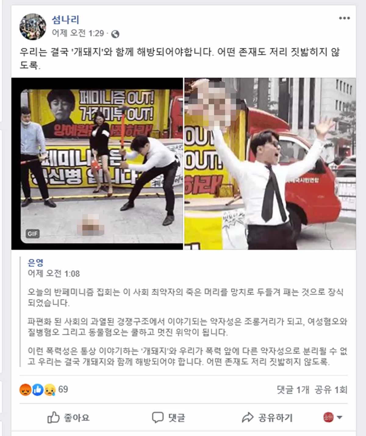 “존재에 대한 혐오와 배제를 반대하는 페미니즘을 규탄한다며 열린 집회는 '사회 최약자'의 머리를 깨부수는 것으로 마무리되었습니다. '메퇘지(메갈+돼지)', '웜퇘지' '먹방'을 한다며 돼지의 머리를 꺼내 바닥에 던집니다. 시장에서 사온 듯 비닐 봉지에 담겨 있습니다. 그러고는 울리는 풍악속에 망치로 머리를 산산조각 냅니다. 산산조각 나 형체가 무너진 돼지의 머리를 들고 환호합니다. '돼지 먹방'이라고 소리지르며 즐거워합니다. 네. 이것은 '합법'입니다. 머릿고기 편육은 장례식에도 있고 국밥집에도 있고요. 죽은 돼지의 몸은 널려 있습니다. 그런데 이건 '고기'일까요? 세상을 느끼는 몸을 가졌던, 살고싶었던 '누군가'의 머리라고 생각하면 이 폭력적인 사회의 모습이 더 제대로 드러납니다. 이들이 외치고 있는 폭력적인 여성혐오 구호들의 의미도 더 선명하게 다가옵니다. 네. 이것은 '폭력'입니다. 도처에 널려 있는 한 번뿐인 '죽음'입니다. 우리의 사회, 우리 삶의 모습입니다. 저는 저 바닥에 뭉개진 누군가의 머리에서 시작하고 싶습니다. 우리는, '개돼지'와 함께 해방돼야 합니다.”