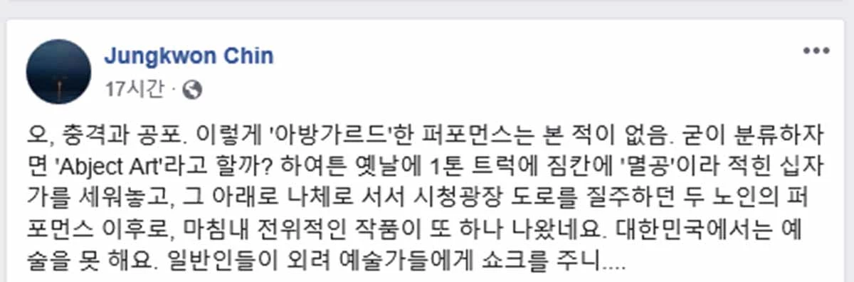 “오, 충격과 공포. 이렇게 '아방가르드'한 퍼포먼스는 본 적이 없음. 굳이 분류하자면 'Abject Art'라고 할까? 하여튼 옛날에 1톤 트럭에 짐칸에 '멸공'이라 적힌 십자가를 세워놓고, 그 아래로 나체로 서서 시청광장 도로를 질주하던 두 노인의 퍼포먼스 이후로, 마침내 전위적인 작품이 또 하나 나왔네요. 대한민국에서는 예술을 못해요. 일반인들이 외려 예술가들에게 쇼크를 주니….”