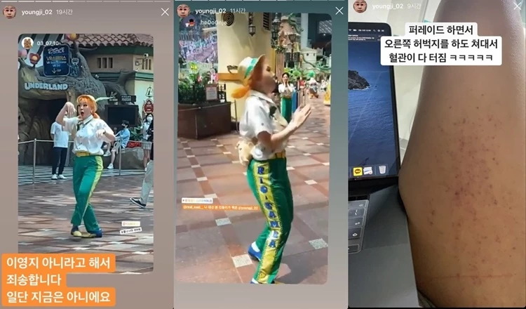 이영지 양은 퇴근 후 자신의 허벅지에 멍이 든 사진을 올렸다. 그러면서 "퍼레이드하며 오른쪽 허벅지를 하도 쳐대서 혈관이 다 터졌다"고 말했다.