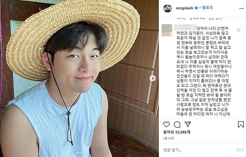 실명까지 직접 밝힌 김 모 씨는 송 씨와 군대 동기다. 그는 "대익아 나다. 27전차작전과"라며 말을 꺼냈다. 송 씨는 제26기계화보병사단에서 행정병으로 만기 전역했다.