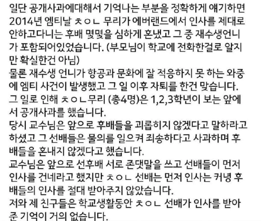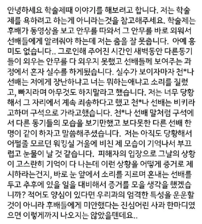 글쓴이는 "천안나 씨가 6일 인스타그램에 후배들을 괴롭힌 적 없다고 주장했는데 사실이 아니다"라며 "진작 인정하고 사과했으면 이런 일은 없었을텐데 현재 그에게 당한 학번들 단톡방에서 증거를 수집 중"이라고 밝혔다.