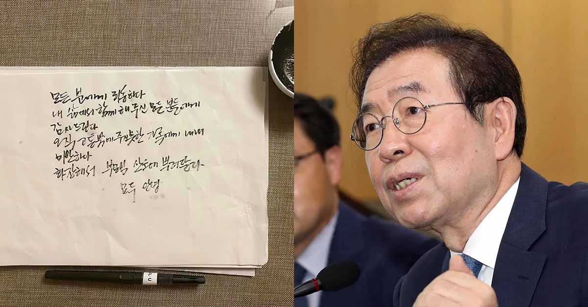 박 시장은 "오직 고통밖에 주지 못한 가족에게 내내 미안하다"며 "화장해서 부모님 산소에 뿌려달라"고 말했다. 그는 "모두 안녕"이라는 말로 유서를 맺었다.