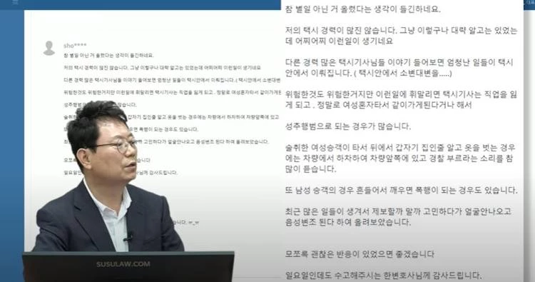 지난 20일 교통사고 전문 변호사 한문철 씨는 자신의 유튜브 채널에 ‘택시기사입니다. 술 취한 여성에게 성추행을 당했습니다’라는 영상을 올렸다.