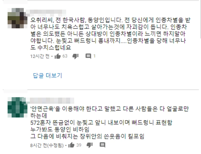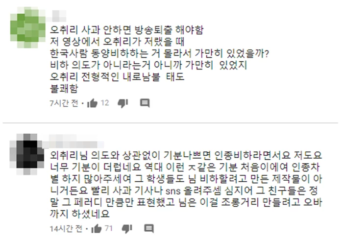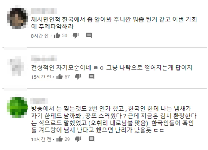 2015년 5월 유튜브에 올라왔던 비정상회담 '얼굴 찌푸리기 대회' 관련 영상에는 댓글들이 계속해서 쌓이고 있다. 약 5년도 지난 영상에 네티즌들은 샘 오취리의 행동을 크게 비판하는 댓글을 남기고 있다.