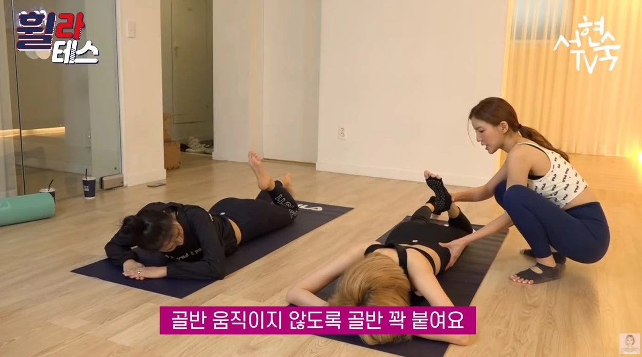 강사가 엎드려 있는 서현숙을 도와 서현숙 발목을 엉덩이 쪽으로 당겼다.