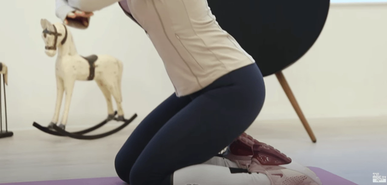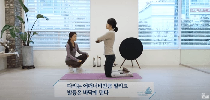 우선 무릎을 꿇고 상체를 세운 뒤 양손은 팔꿈치에 댄다-> 다리는 어깨너비만큼 벌리고 발등은 바닥에 댄다-> 몸을 세운 상태에서 호흡을 마시며 엉덩이를 뒤로 쭉 뺀다-> 내쉬는 호흡에 엉덩이와 허벅지를 조이면서 일어선다