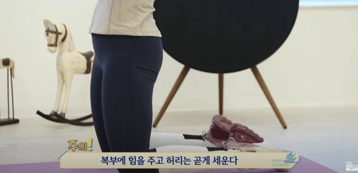 동작을 하면서 복부에 힘이 풀리지 않게 유지하고, 허리를 곧게 세워야 한다.