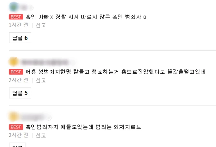 그런가 하면 "흑인들이 총을 맞는 건 당연하다"라는 누리꾼들 의견도 등장했다. 이들은 "솔직히 총 맞을만하다. 미국 경찰이 몇 번이고 위협하고 경고 사격까지 하는데도 가만히 있지를 못하고 움직인다", "주머니에서 손을 빼라고 했는데 안 뺀단다 거나 특정 위협 행동을 제지하는데도 도무지 예측 불가능한 행동만 골라서 한다", "자업자득이다" 등 체포 과정에서 흑인들의 태도를 이해할 수 없다는 반응을 내놓았다.