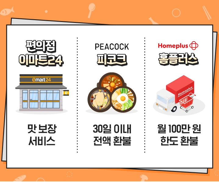 이마트는 가정간편식(HMR) 브랜드인 피코크 제품을 구입한 소비자가 맛이나 품질에 만족하지 못하면 30일 이내에 전액 환불해 주고 있다. 홈플러스 역시 채소나 우유 등 신선식품을 월 100만 원 한도에서 조건없이 환불해 주는 정책을 운용하고 있다.