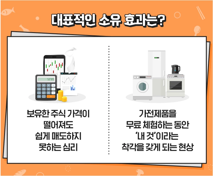 제품을 사용하거나 입어보는 과정에서 소비자는 ‘내 것’이라는 생각을 갖게 된다. 값비싼 가전제품을 일정 기간 무료로 체험할 수 있게 제공하는 것 역시 소유 효과를 노린 마케팅 기법이다.