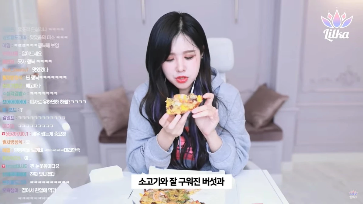 이후 배달 온 피자를 받은 릴카는 감격했다. 릴카는 "씬도우라 바삭바삭하다. 소고기와 잘 구워진 버섯과 새우가 있다. 참고로 광고 아니다"라며 먹방을 시작했다.