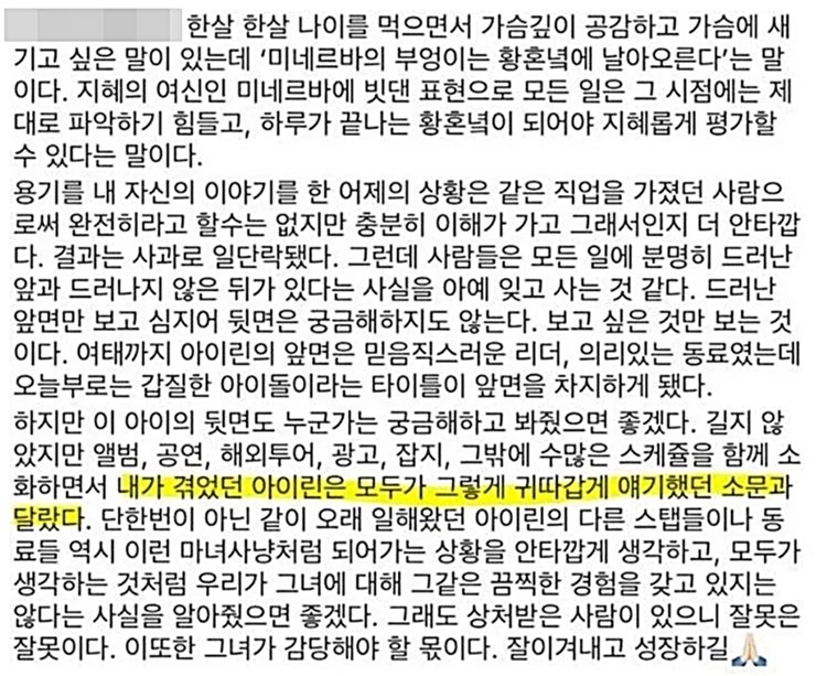 글쓴이는 "여태까지 아이린의 앞면은 믿음직스러운 리더, 의리 있는 동료였는데 오늘부터는 갑질한 아이돌이라는 타이틀이 앞면을 차지하게 됐다"며 "이 아이의 뒷면도 누군가는 궁금해하고 봐줬으면 좋겠다. 수많은 스케줄을 함께 소화하면서 내가 겪었던 아이린은 모두가 귀따갑게 얘기했던 소문과 달랐다"고 덧붙였다.