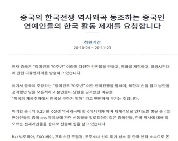 청원인은 "한국에서 데뷔해 세계적으로 인지도를 쌓은 중국인 연예인들이 중국 SNS인 웨이보에 (중국의 6·25 한국전쟁 역사 왜곡) 관련 선동물을 업로드하고 있다"며 "같은 중국인들, 한국 역사에 대해 잘 모르는 전 세계인들을 상대로 선동에 힘을 싣고 있다"고 주장했다.