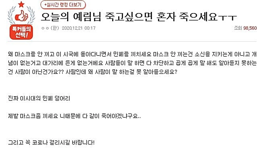 지난 21일 네이트판에는 '오늘의 예림님 죽고 싶으면 혼자 죽으세요'라는 게시물이 올라왔다. 글쓴이는 "이 시대의 민폐 덩어리. 제발 마스크 좀 껴라. 너 때문에 다 같이 죽어야겠냐. 꼭 코로나 걸리시길 바란다"라고 비난했다.