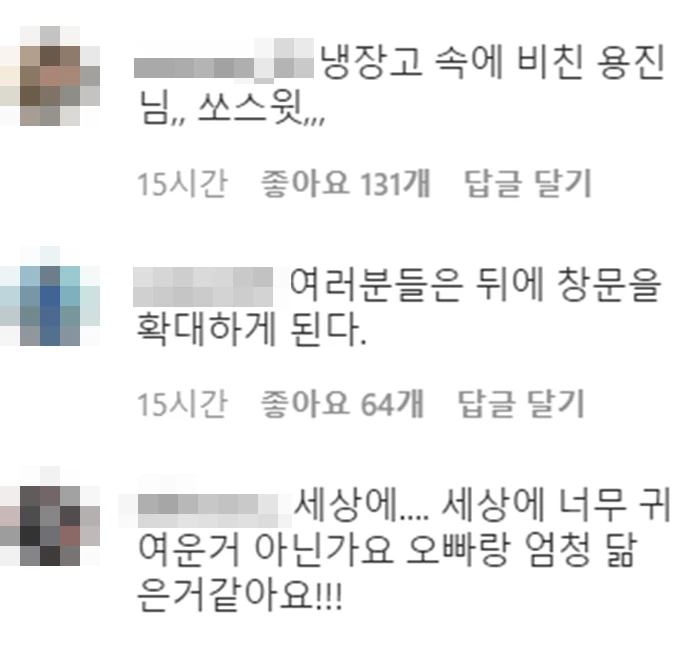 동료 개그맨 이진호는 "형 얼굴이 조금씩 보인다"라고 말했고, 미키광수(박광수)는 "아따마 말 안 듣게 귀엽게 생겼네"라고 농담을 던졌다. 누리꾼들은 "냉장고 속에 비친 용진 님. 소 스윗", "세상에. 너무 귀여운 거 아닌가요. 오빠랑 엄청 닮았어요", "누가 봐도 이용진 아들"이라는 등 뜨거운 반응을 보였다.