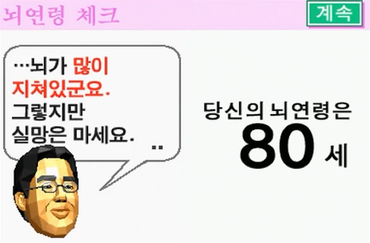게임 ‘매일매일 두뇌 트레이닝’은 2005년 처음 닌텐도 DS로 발매, 장동건, 안성기, 이나영 등 톱스타를 광고 모델로 내세우며 큰 인기를 끌었다. 단순하면서도 심오한 ‘두뇌 퍼즐’로 구성된 이 게임은, 게임이 아이들이나 하는 것이라는 인식을 타파해 어른들도 많이 즐기며 ‘국민 게임’ 반열에 올랐다.