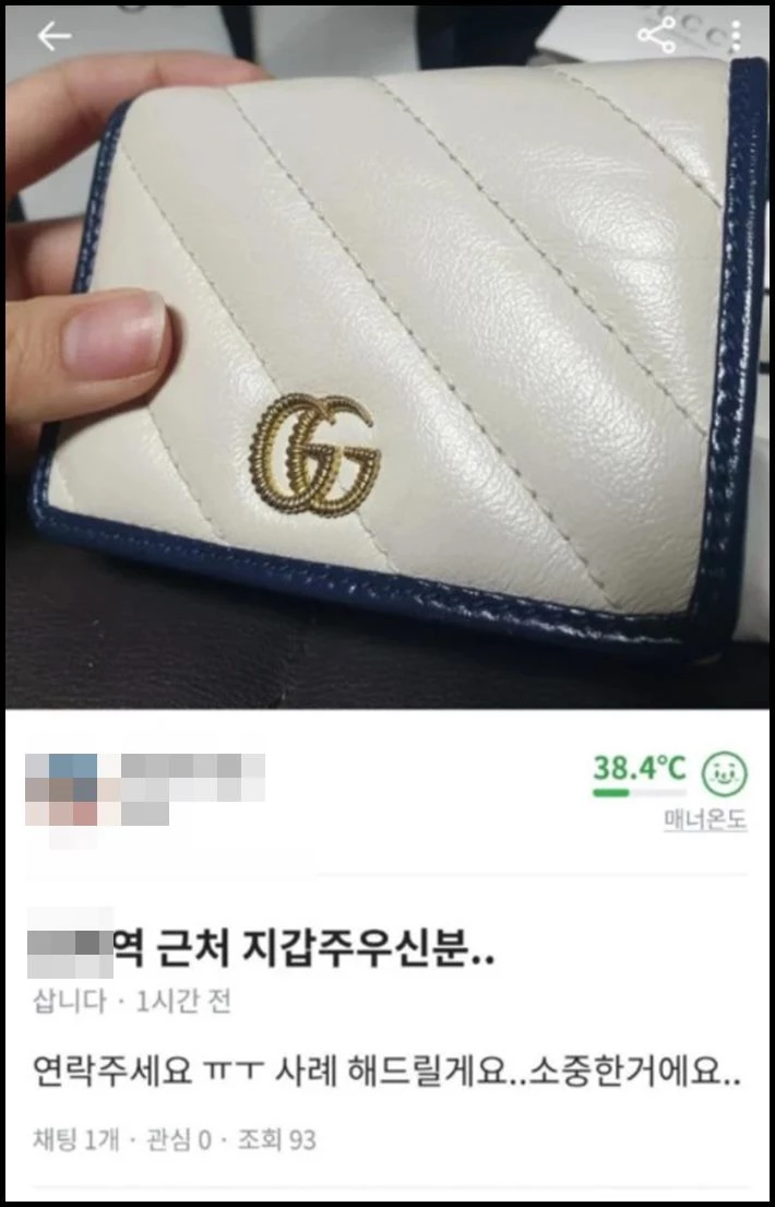 지난 20일 당근마켓에는 'XX역 근처 지갑 주우신 분..'이라는 게시글이 올라왔다. 해당 글을 남긴 이용자 A 씨는 "연락 주세요ㅠㅠ사례해 드릴게요..소중한 거예요"라는 글과 함께 자신의 지갑 사진을 올렸다.