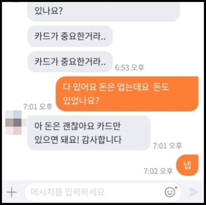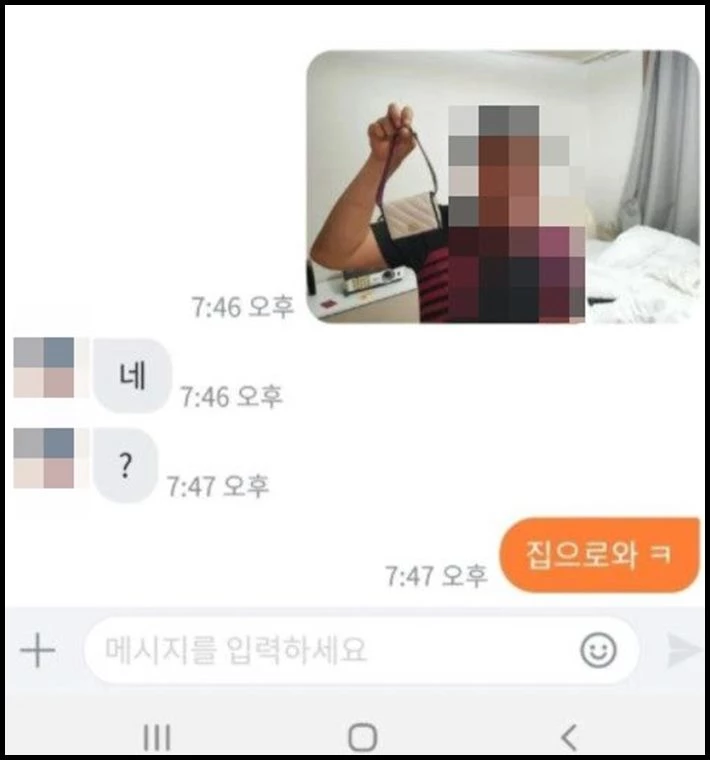순조롭게 이어지던 채팅은 '반전 사진' 한 장으로 끝이 났다. B 씨는 갑자기 채팅창에 지갑을 손에 들고 해맑고 웃는 한 중년 남성 사진을 올렸다. 이어 그는 "집으로 와ㅋ"라는 말을 덧붙였다.
