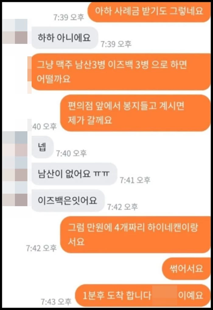 그러자 다른 이용자 B 씨는 A 씨에게 자신이 지갑을 주웠다는 메시지를 보냈다. 이후 두 사람은 "제가 가겠다. 역 이름만 알려달라", "사례금은 얼마나 주실 거죠?", "XX역에서 멀지 않은 아파트인데 거기 입구서 보면 안 되겠냐", "사례금 받기도 그렇다...그냥 맥주 남산 3병, 이즈백 3병으로 하면 어떻겠냐", "편의점 앞에서 봉지 들고 계시면 제가 갈게요" 등의 말로 채팅을 주고받았다.