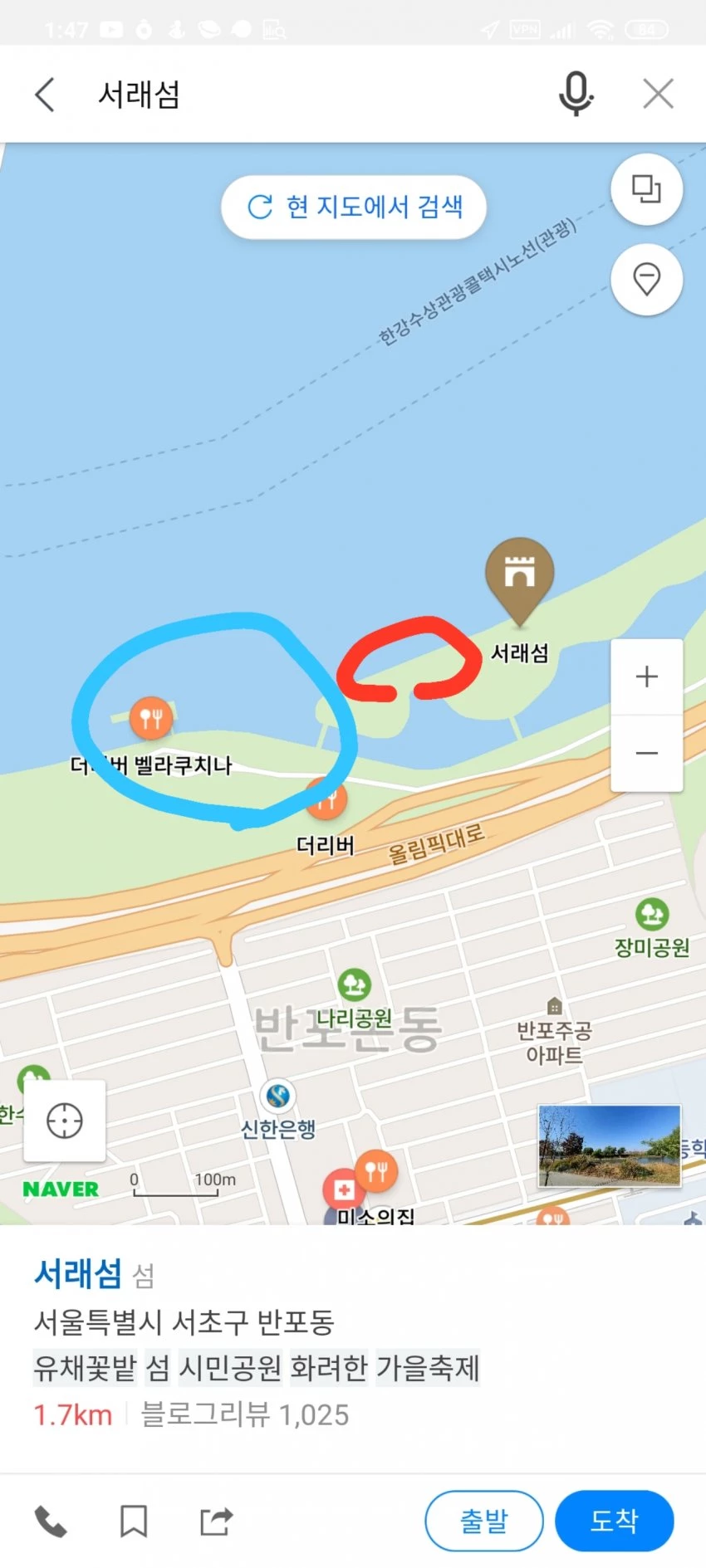 그는 “자신은 나는 빨간색 원(서래섬)에 있었고 경찰은 파란색 부근에 있었다”라면서 경찰차가 출동한 장소도 공개했다. 낚시꾼이 공개한 사진에는 출동한 경찰차의 모습이 담겨 있다.
