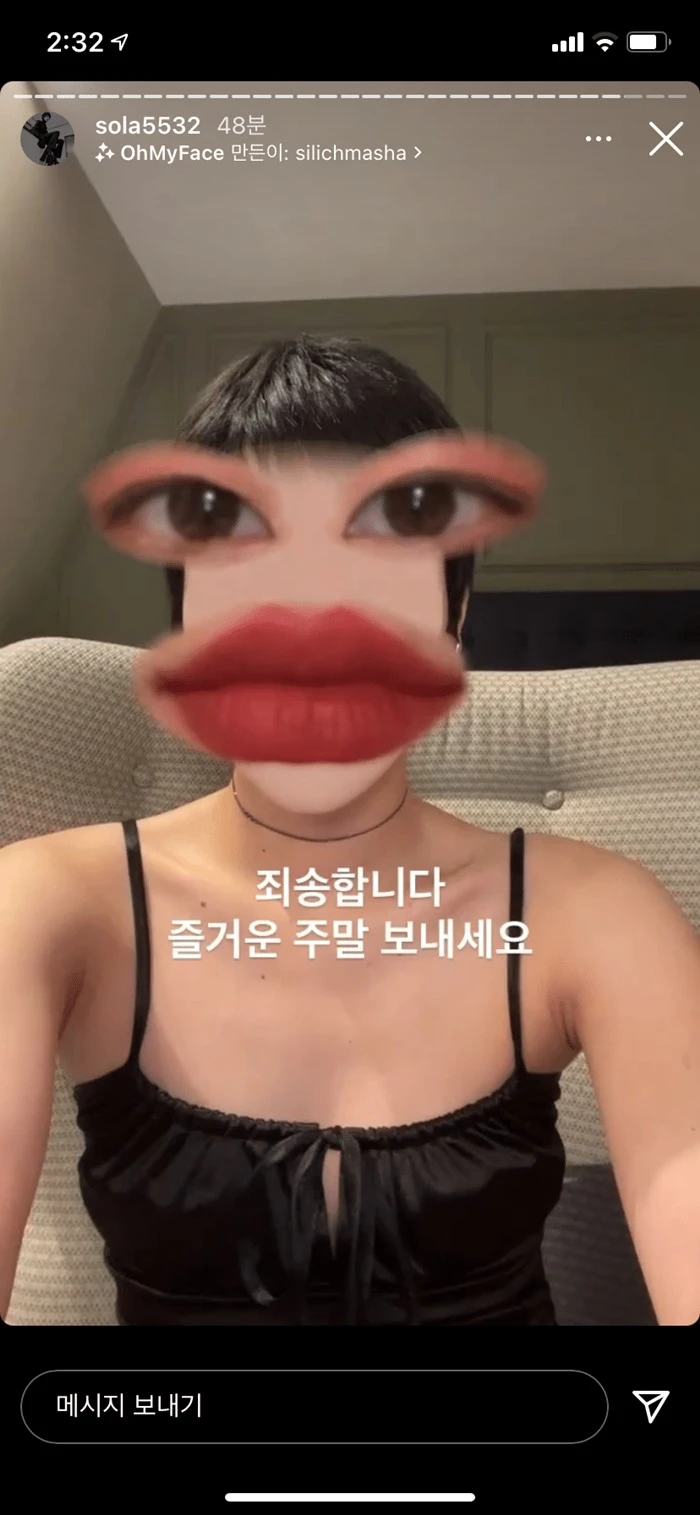 그는 필터에 걸맞게 매번 표정을 바꿔가면서 재밌는 사진 연출을 위해 애썼다. 최소라는 "죄송합니다. 즐거운 주말 보내세요"라고 적었다.