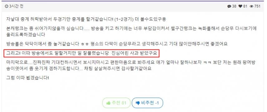 이하 트위치 TV '순당무'한편 게재된 글을 보면 순당무가 어느 정도 상처를 털고 일어났음을 알 수 있다. 지난 2일 방송에서 순당무는 "이럴 줄 알았으면 그냥 (챌린저라는 사실을) 공개하지 말걸"이라며 울먹여 많은 팬들의 안타까움을 샀다.