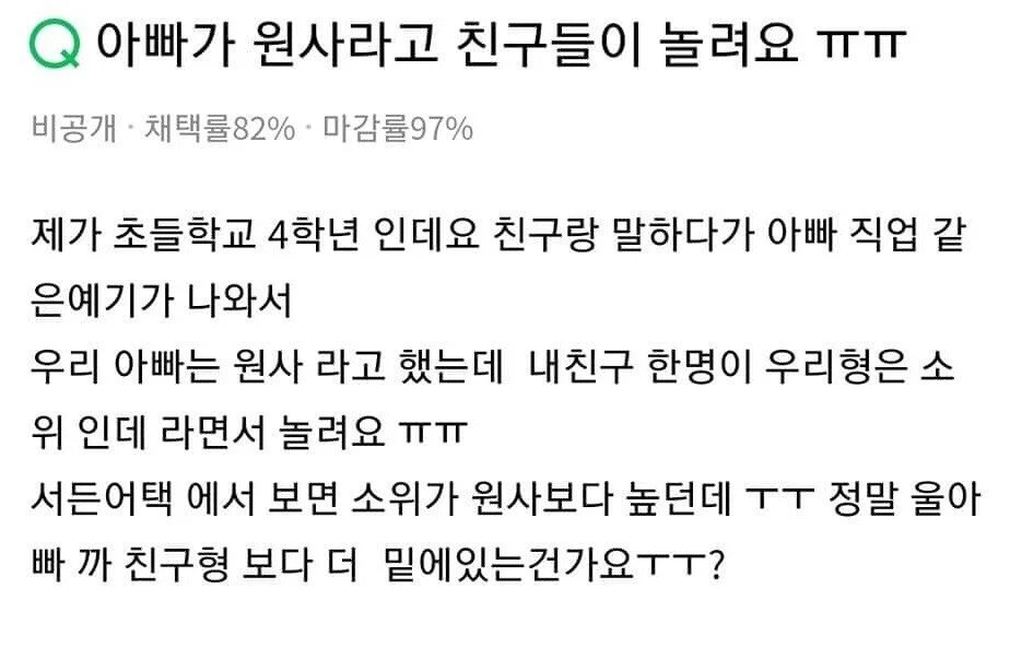 작성자는 "게임 같은 데서 보면 소위가 원사보다 높은데 아빠가 친구 형보다 밑에 있나요"라고 속상한 마음을 토로했다.