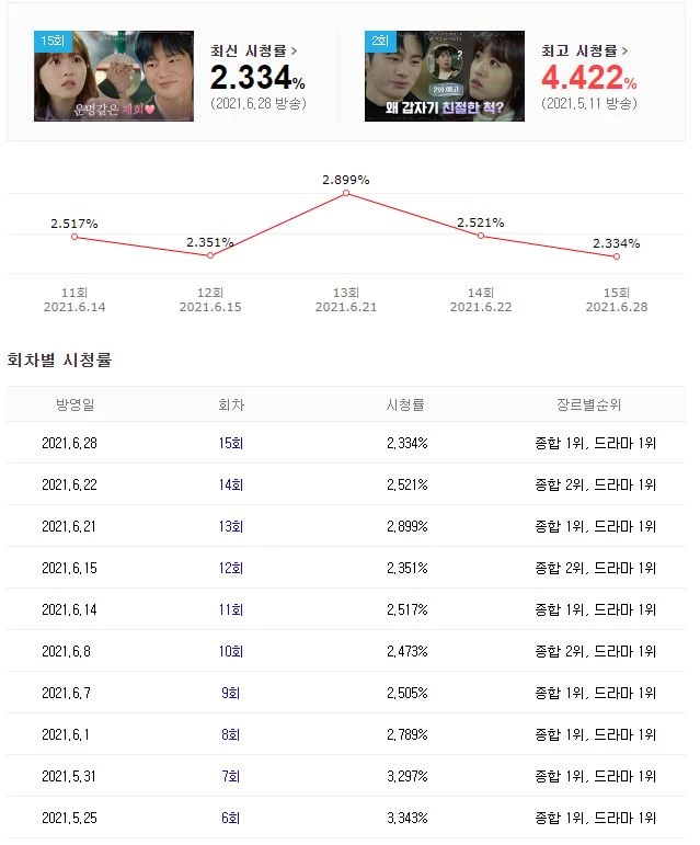 이는 지난 22일 방송된 14회 시청률 2.521%보다 낮아진 수치다. 2회 자체 최고 시청률 4.422%를 기록했던 '멸망'은 3회부터 시청률 3%대를 기록하다 8회부터 2%대를 기록했다. 다만 시청률과 다르게 장르별 순위에서는 종합 1위, 드라마 1위를 차지했다.