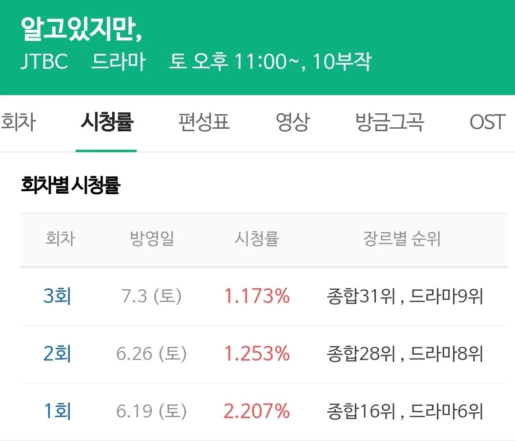 JTBC 드라마 '알고 있지만,' 시청률이 소폭 하락했다.