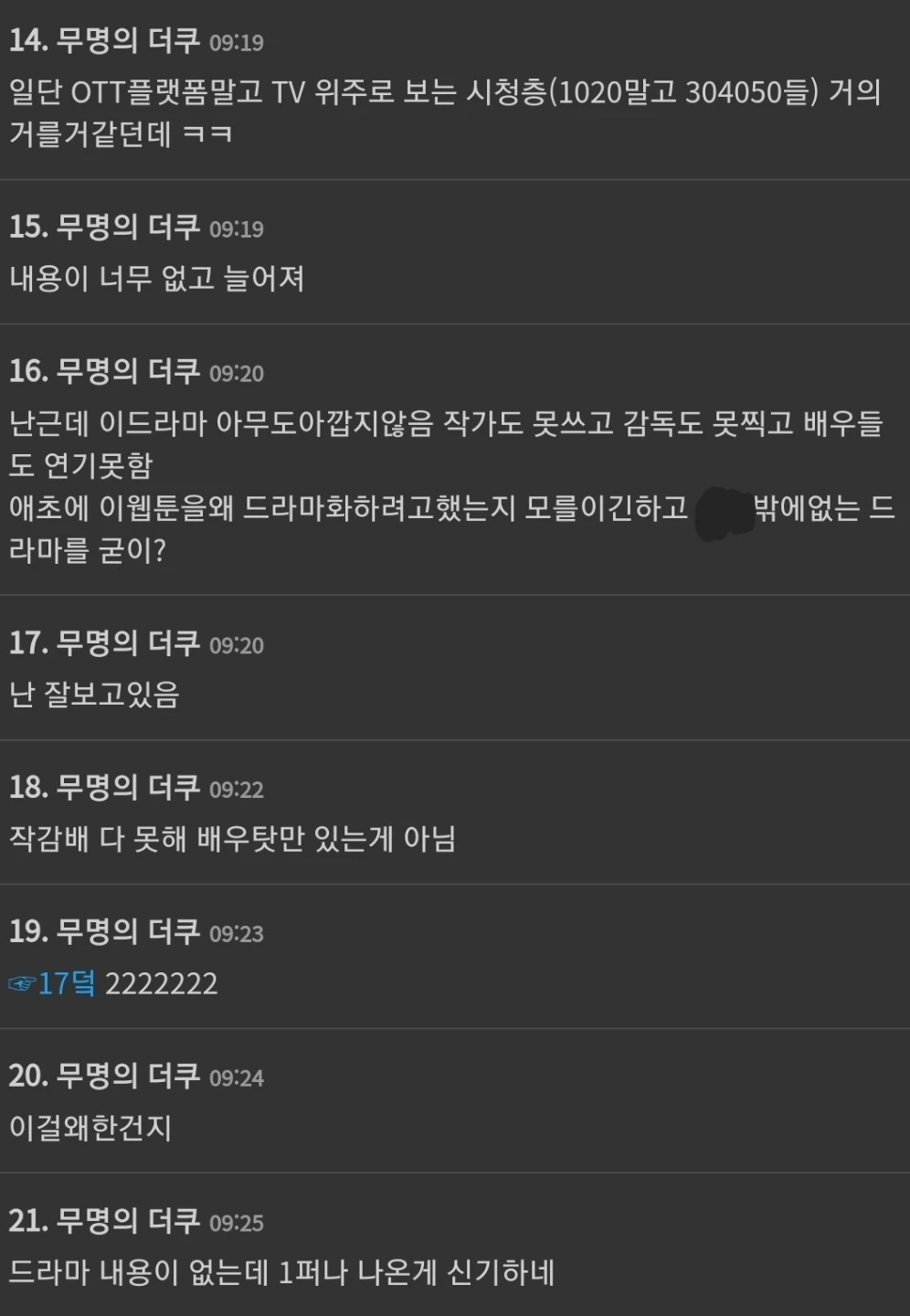 시청률을 본 네티즌들은 주연 배우인 송강과 한소희의 연기력, 작가의 필력을 문제 삼았다. 네티즌들은 "내용이 너무 없고 늘어진다", "작가도 못 쓰고, 감독도 못 찍고, 배우들도…", "0.9까지 갈 듯"이라며 의견을 남겼다.