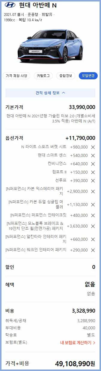 게시물에 따르면 한 누리꾼이 현대차의 신차 아반떼 N의 풀옵션을 4910만8990원에 구입했다.