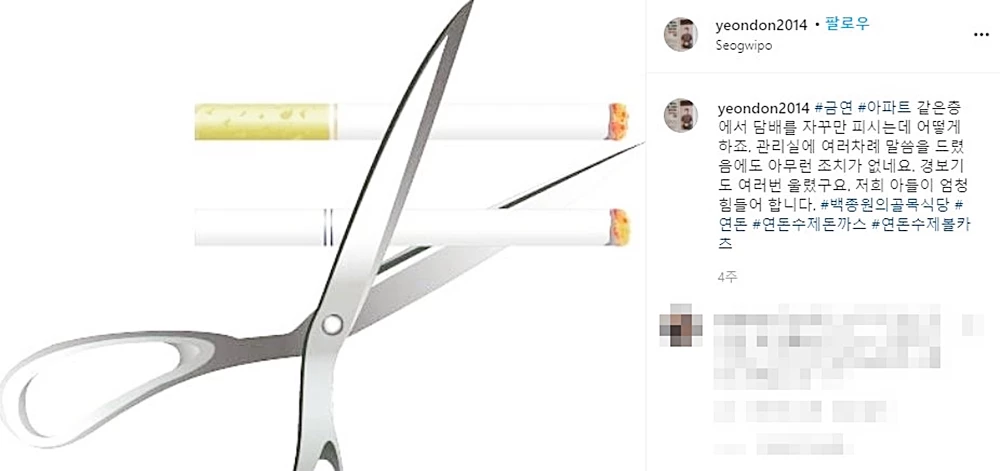 그는 "아파트 같은 층에서 (이웃 주민이) 담배를 자꾸만 피우는데 어떻게 하죠"라며 "관리실에 여러 차례 말씀을 드렸음에도 아무런 조치가 없네요"라며 분개했다.