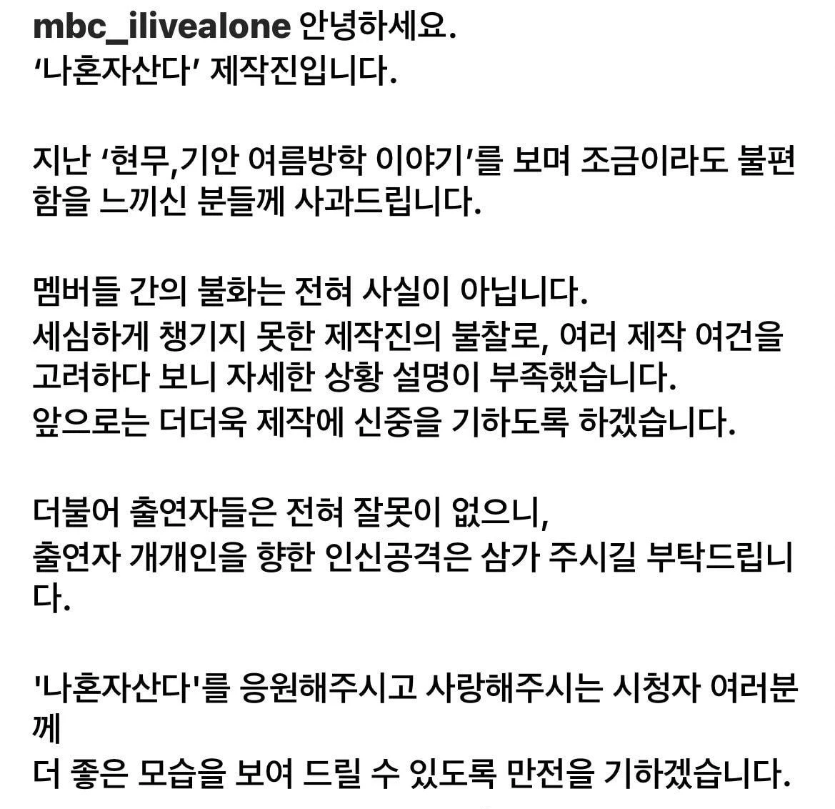 제작진은 "지난 '현무, 기안 여름방학 이야기'를 보며 조금이라도 불편함을 느끼신 분들께 사과드린다. 멤버들 간의 불화는 전혀 사실이 아니다. 세심하게 챙기지 못한 제작진의 불찰로, 여러 제작 여건을 고려하다 보니 자세한 상황 설명이 부족했다"라고 밝혔다.