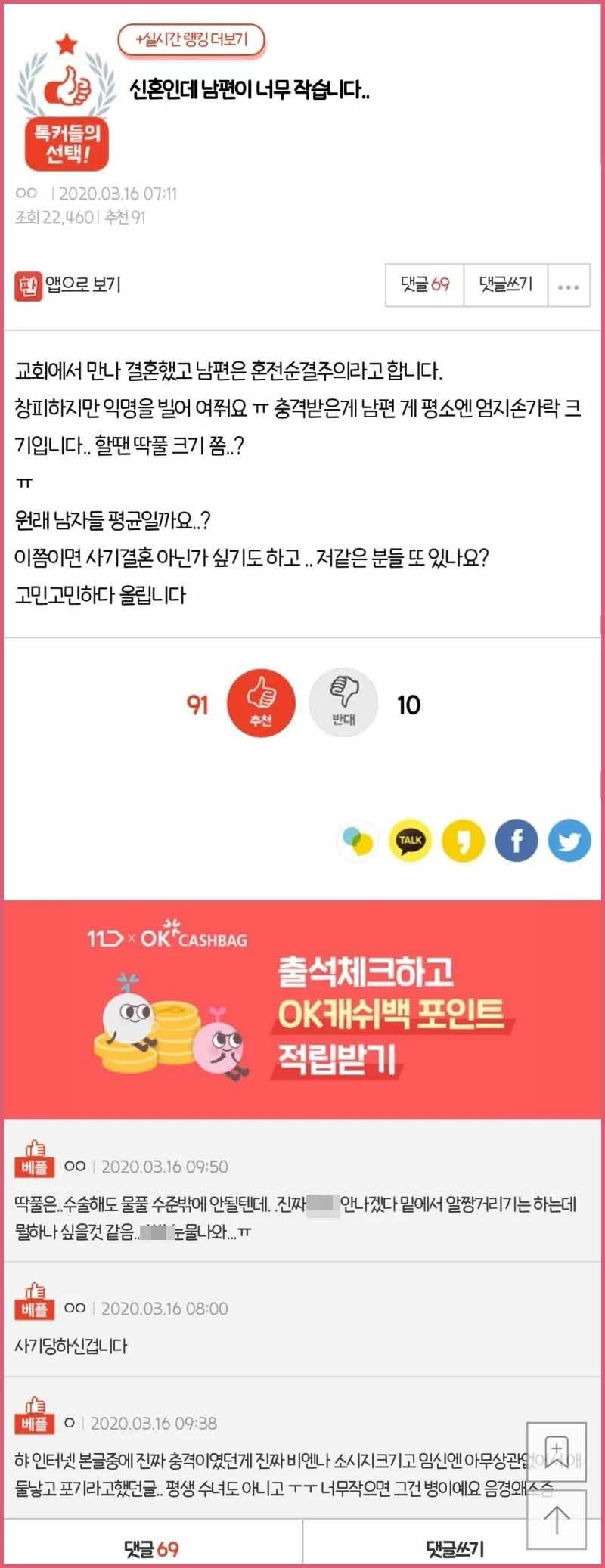 원글의 글쓴이는 “교회에서 만나 결혼했다. 남편은 혼전순결주의자였다”라면서 “충격받은 게 남편 게 평소엔 엄지 크기고 일을 치를 땐 딱풀 크기라는 점이었다”라고 말했다. 그는 “이쯤이면 사기결혼 아닌가 싶기도 하다. 저 같은 사람들 또 있나. 고민하다 글을 올린다”고 했다.