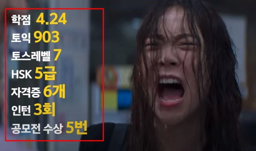 영화 '쇼미더고스트' / 이하 유튜브'컬처앤스타'옥에 티는 취업에 실패한 한승연이 비에 홀딱 젖은 채로 한탄하는 장면에서 나왔다. 한승연은 자신의 정량적 스펙을 나열하며 "뭘 더 하라는 거야"라며 울부짖는다.