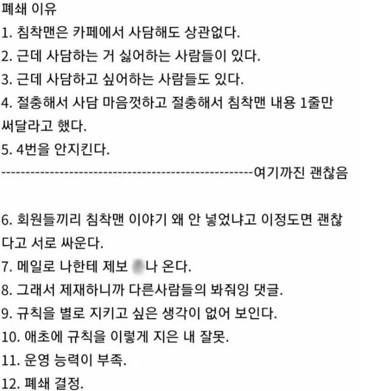 침착맨은 3일 자신의 온라인 팬카페에 '카페 폐쇄 이유'라는 게시글을 올렸다. 공식 카페를 폐쇄하기로 결정한 침착맨이 팬들에게 그 이유를 설명하기 위함이었다.