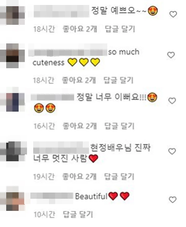 해당 사진을 본 누리꾼들은 "정말 예쁘다", "너무 귀엽다", "정말 너무 이뻐요", "현정 님. 진짜 너무 멋진 사람", "아름다워요", "두 분 다 너무 예뻐요" 등 댓글을 남겼다.