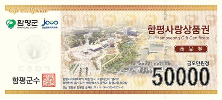 함평군은 3일 “함평사랑상품권 1만원권 도안에는 함평 신광면에 복원된 ‘상해 대한민국 임시정부청사’와 ‘일강 김철 선생 기념관’을, 5만원권에는 올 초 공식 개장한 함평자동차극장 전경을 넣고, 추가로 관광지 안내 문구를 삽입했다”고 밝혔다.