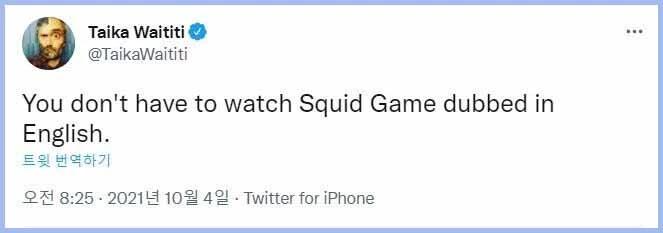 타이카 와이티티 감독이 4일 자기 트위터에 “여러분은 영어로 더빙된 ‘오징어 게임’을 보면 안 된다”는 게시물을 올렸다. 알고 보니 더빙판으로 ‘오징어 게임’을 보면 한국 배우들의 연기를 제대로 감상할 수 없다는 뜻이다.