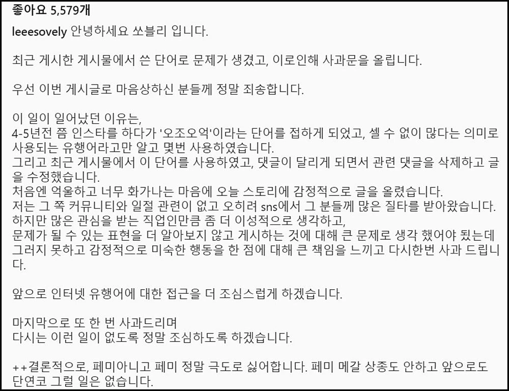 그러나 논란이 쉽게 가라앉지 않았고 쏘블리는 결국 사과문을 올렸다. 쏘블리는 "이번 게시글로 마음 상하신 분들께 정말 죄송하다"라며 "4~5년 전쯤 인스타를 하다가 '오조오억'이라는 단어를 접하게 됐고 '셀 수 없이 많다'는 의미로 사용되는 유행어로만 알고 몇 번 사용했다"라고 말했다.
