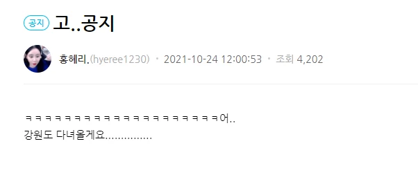 다음날 둘은 강원도 여행을 떠났다. 홍혜리는 자신의 아프리카TV 게시판에 "고... 공지 강원도 다녀올게요..."라는 글을 남기며 둘의 여행 사실에 대해 밝혔다. 그는 이후 강원도에서 임진묵과 찍은 사진을 공개하기도 했다.