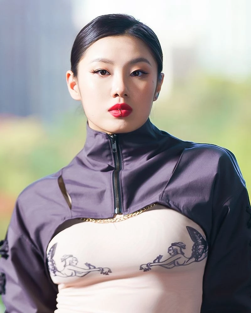 이날 리더들은 각자의 개성을 보여주는 의상을 입고 등장했다. 그 가운데 리정은 짙은색의 볼레로 재킷을 걸친 뒤 가슴 부분에 포인트 문양이 그려진 누드톤 상의를 입고 나타나 특히 이목을 끌었다.