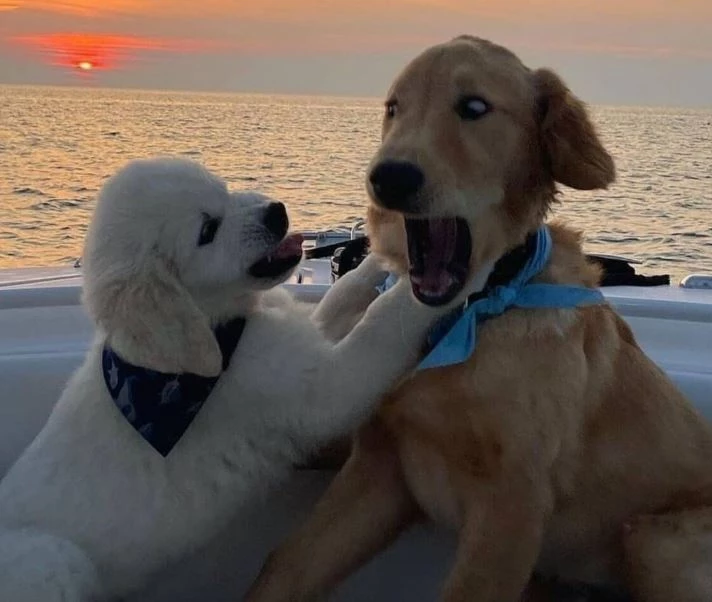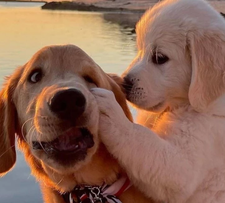 사진 속 강아지들은 마치 가족처럼 친근한 모습을 보이고 있다. 강민경의 흰색 강아지가 이해리의 금색 반려견에게 장난치는 모습은 보는 사람을 미소 짓게 만든다.